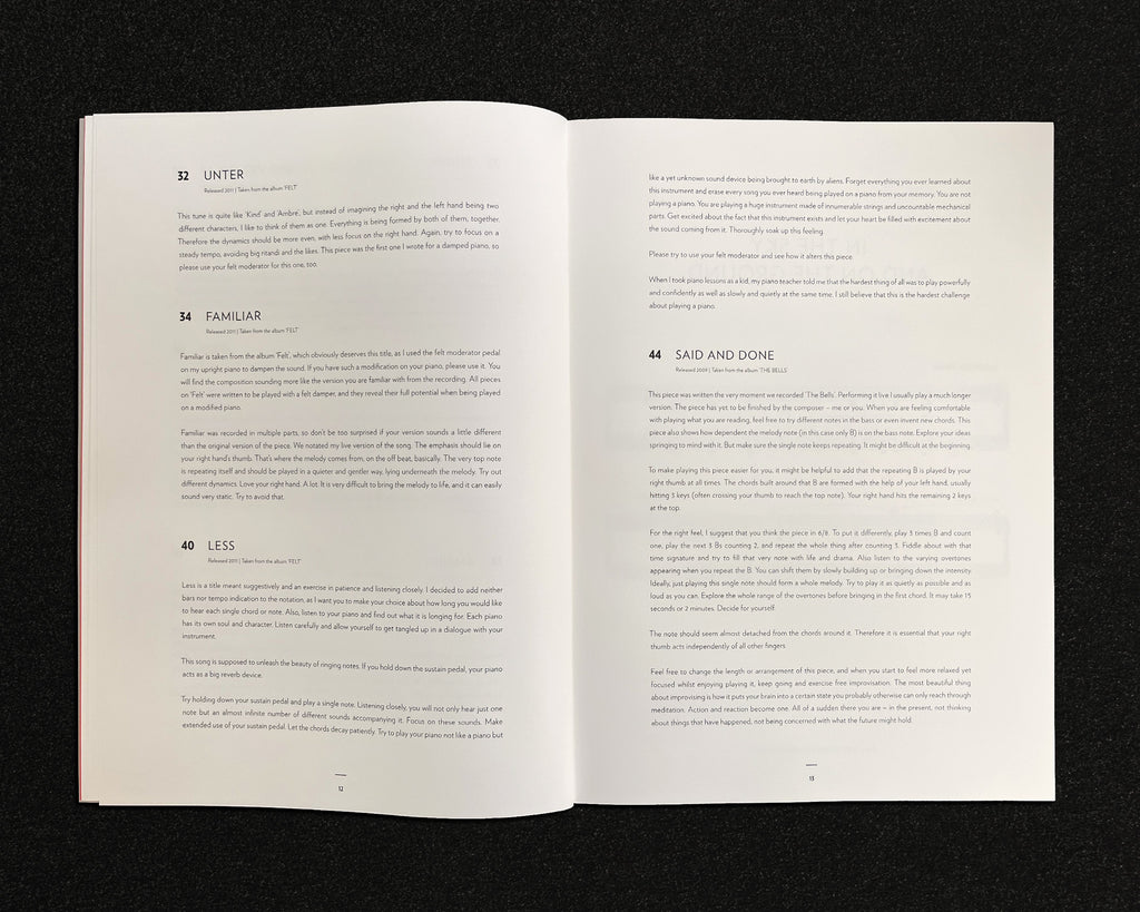 SHEETS EINS contains the sheet music for ten of Nils’ piano pieces taken from his albums Felt, The Bells and Wintermusik. The original hard backed version of SHEETS EINS quickly sold out and has since become a collectors item. This third edition of the book comes as a high quality soft-cover version. Illustrated instructions on modifying your piano accompany the pieces. Design by Studio Torsten Posselt, produced in Berlin.